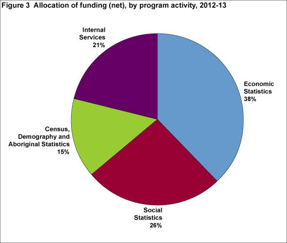 Figure 3 shows how net funding will be distributed by program activity in 2012-13. Census, Demography and Aboriginal Statistics will account for 15% of overall spending, a smaller share than in 2011-12, the peak year of the census cycle. Economic Statistics will account for 38% of spending in 2012-13 and Social Statistics, 26%.